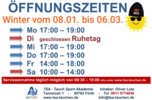 Unsere Öffnungszeiten vom 08.01. bis 06.03.2026: Montag 17:00 – 19:00 Uhr Dienstag Ruhetag Mittwoch 17:00 – 19:00 Uhr Donnerstag 17:00 – 19:00 Uhr Freitag 14:00 bis 18:00 Uhr Samstag von 10:00 – 14:00 Uhr